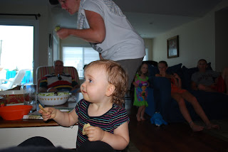 At the beach she was sharing a space with upwards of 20 people, most of whom she did not know. After two or three days, she was kissing everyone, even the teenage boys. She went from being shy and reserved to taking people by the hand and leading them to the pool, to the beach, to snacks, to Big Bird, to the deck, to whatever she wanted. She was very concerned about her Poppa, calling to him whenever he left the room and running over to him at regular intervals just to reassure herself that he was there and okay. She would call to me across the living room full of chatty people, yelling "Maaaaaaammaaaaa!" in a singsong voice, just to make sure I knew she was there.